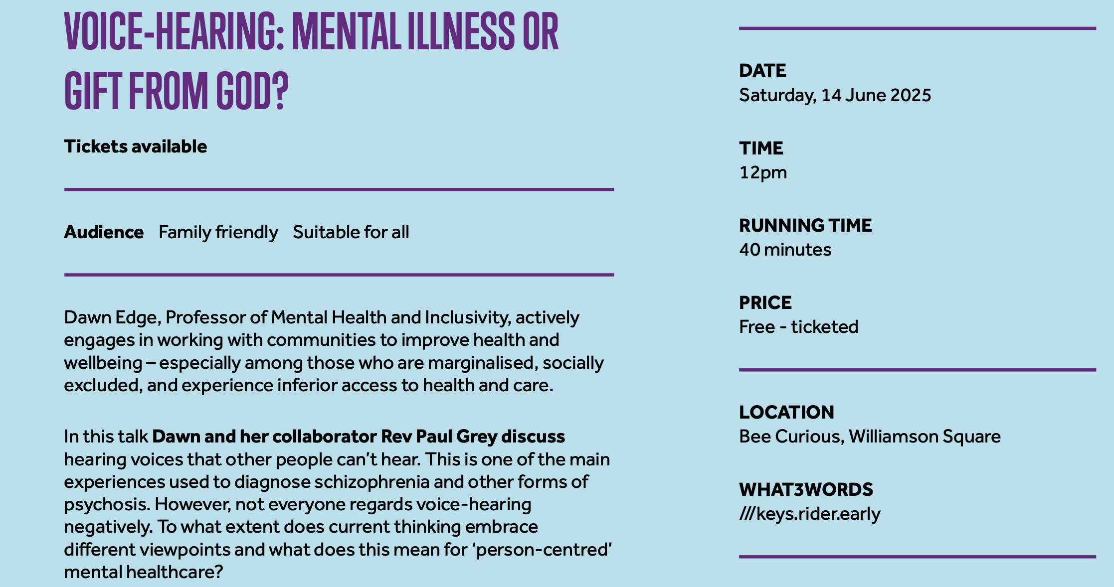 In this talk Dawn and her collaborator Rev Paul Grey discuss hearing voices that other people can’t hear. This is one of the main experiences used to diagnose schizophrenia and other forms of psychosis. However, not everyone regards voice-hearing negatively. To what extent does current thinking embrace different viewpoints and what does this mean for ‘person-centred’ mental healthcare?